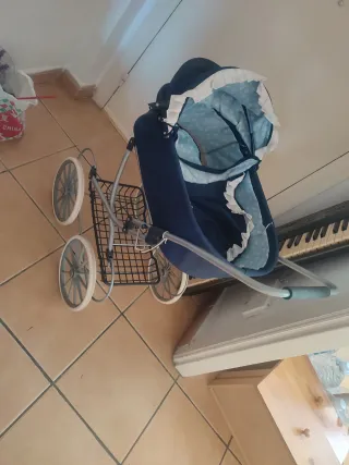 Carro de muñecas con un diseño encantador y detalles cuidados. - Color azul marino. - Interior con estampado de lunares blancos. - Capota con volante blanco. - Cesta inferior. - Ruedas plateadas.