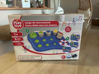 Juego musical de rana con 5 piezas, recomendado para mayores de 1 año. Incluye baterías. - Fabricado en madera natural y plástico resistente. - Incluye 10 melodías famosas. - Diversión interactiva con golpes y sonidos.