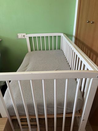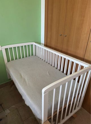Cuna de bebé de color blanco, ideal para habitaciones infantiles. Su diseño clásico se adapta a cualquier estilo. - Estructura de madera. - Barreras de seguridad. Y colchón incluido