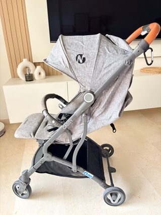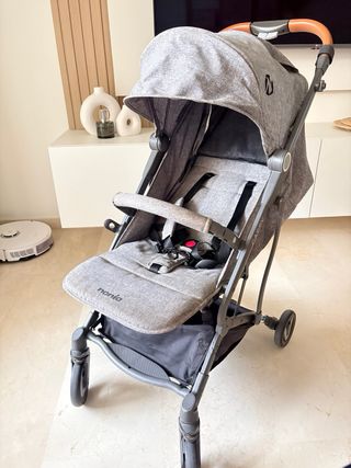 Silla de paseo ligera de la marca Cassy Nania. Es fácil de manejar y transportar. Le falta una de las fundas del cinturón. - Diseño moderno y funcional. - Capota amplia. - Cesta de almacenamiento inferior. - Ruedas delanteras giratorias.