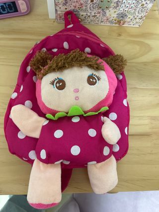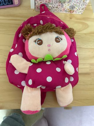 Adorable mochila con diseño de muñeca y fresa. - Color rosa vibrante con lunares blancos. - Detalles de peluche suave. - Tirantes ajustables.