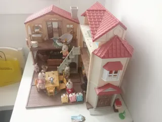 Casa de muñecas Sylvanian Families con detalles luminosos. - Incluye varios pisos y habitaciones. - Accesorios de mobiliario y figuras. - Techo rojo característico.