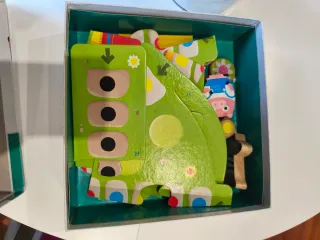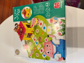 Divertido juego de mesa para niños con piezas de madera y cartón. - Piezas con diseño de los 3 cerditos y el lobo - Incluye un cerdito, un tronco y piezas verdes con formas. - Ideal para el desarrollo de la motricidad fina y la imaginación, y para jugar en familia