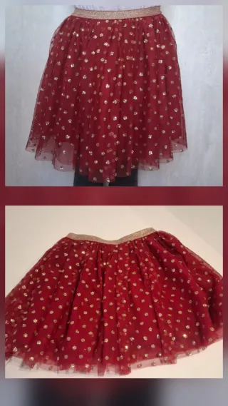 Falda de tul roja con detalles dorados de Kiabi. Talla 8 años(126/131cm) alta 35cm. Diseño con topos dorados. Cintura elástica con acabado brillante. Forro interior de algodón.