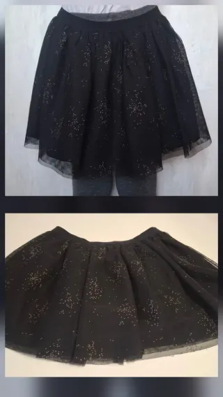 Falda de tul negra con detalles plateados en forma de estrellas. Es una prenda ligera y con vuelo. Talla 8 años 128cm, alta 30cm. Color negro con estampado plateado. Tejido de tul. Forro interior.