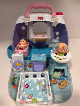 Divertida guardería de Fisher-Price con accesorios y dos figuras. - Incluye cuna, trona, bañera y váter. - Dos figuras de bebé. - Alfombra con diseño de tren y estrellas.