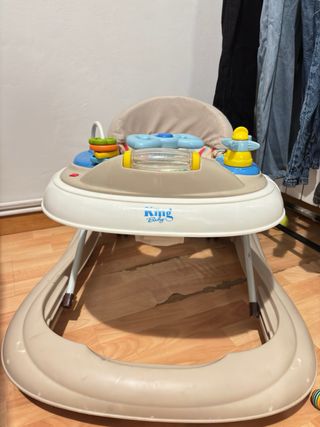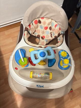 Andador para bebés de la marca King, con varios juguetes interactivos. - Asiento acolchado. - Ruedas giratorias. - Bandeja de juegos con luces y sonidos.