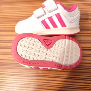 Zapatillas deportivas Adidas en color blanco, talla 27. - Cierre de velcro. - Detalle rosa en el talón y la lengüeta. - Logo de Adidas en el lateral y el talón.