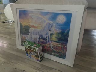 Puzzle de unicornio. 300 piezas. Brilla en la oscuridad. Está hecho y enmarcado. Si lo quieres sin hacer, te lo desmonto y lo envío en la caja, con o sin el cuadro. Como quierason marco blanco, que brilla en la oscuridad.