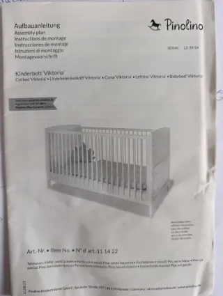 Cuna convertible de madera, modelo Viktoria de Pinolino. Se puede ajustar en 3 alturas. - Material: Madera de pino lacada en blanco. - Modelo: Viktoria. - Marca: Pinolino. - Número de artículo: 11 14 22. - Serie: LZ-39/24.