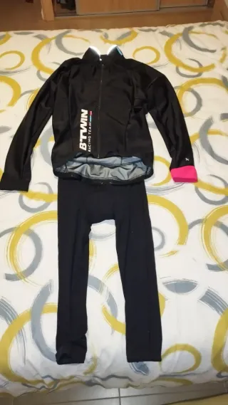 Conjunto de ropa para ciclismo de la marca Btwin y Berg - Chaqueta negra con detalles reflectantes. - Pantalón largo negro. - Mangas con puños rosas. -Está implecable, solo ha tenido dos puestas por mi hijo, mejor ver. Pantalón para 13-14 años y chaqueta talla S