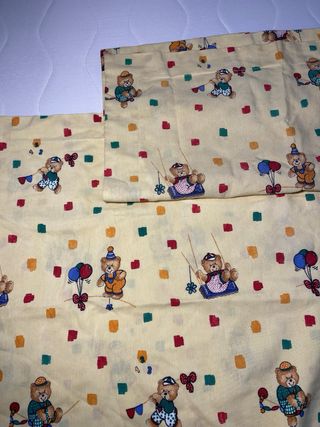 Funda de almohada con un alegre estampado de osos jugando y globos. Medidas: Largo= 56 Ancho= 57,5 - Diseño infantil con osos. - Fondo amarillo con detalles de colores.
