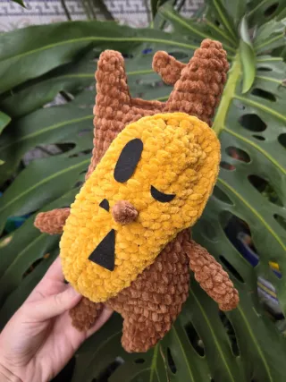 Adorable peluche de Korok con temática otoñal. - Hecho a mano. - Diseño inspirado en el personaje de The Legend of Zelda. - Colores cálidos y otoñales.