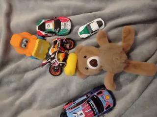 Conjunto variado de juguetes . - Peluche de oso de color marrón. - Coche de carreras azul con detalles de Hyundai. - Moto de carreras con diseño de tiburón. - Coche blanco y verde. - Coche rojo, blanco y verde con patrocinadores.