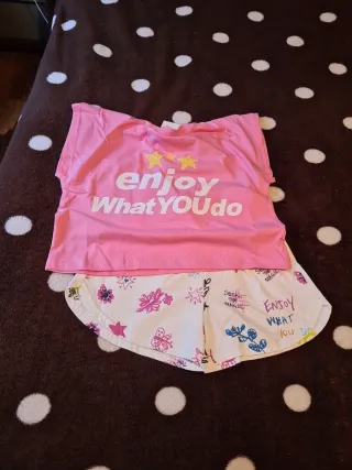 Conjunto de camiseta y pantalón corto para niña de Zara. - Camiseta rosa con estampado enjoy What YOUdo y estrellas. - Pantalón corto blanco con estampado de mariposas y texto. - Talla 11-12 años.