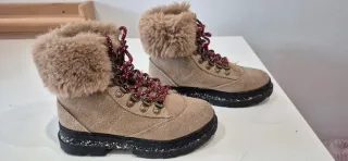 Botas de niña Zara con un diseño moderno y abrigado. - Exterior de ante en color beige. - Forro interior de pelo sintético. - Cordones rojos y negros. - Suela negra con detalles blancos.