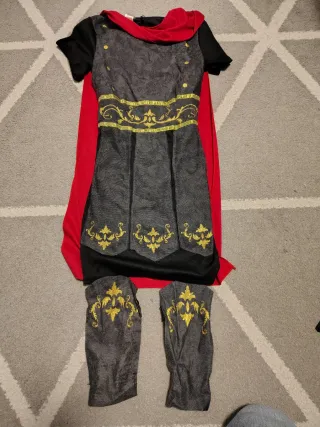 Disfraz de estilo romano para niños, talla 7-9 años. Incluye túnica, capa y brazaletes. - Túnica gris con detalles dorados. - Capa roja. - Brazaletes y tobilleras a juego con la túnica.