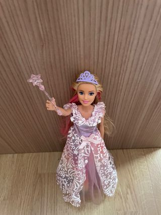 Muñeca Barbie con temática de princesa, lista para un cuento de hadas. - Corona de tiara rosa. - Vestido largo en tonos morados y blancos. - Detalle de lazo rosa en la cintura.