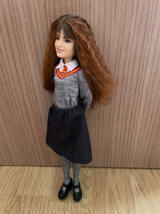 Muñeca de Hermione Granger de Harry Potter, con su uniforme de Hogwarts. - Vestido gris con escudo de Gryffindor. - Falda negra. - Medias grises. - Zapatos negros.