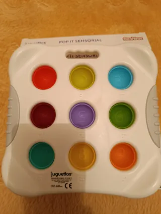 Juguete sensorial Pop It con múltiples botones de colores y texturas. - Nueve botones de diferentes colores: azul, amarillo, rojo, verde, morado, burdeos, naranja, amarillo y turquesa. - Cada botón tiene un diseño o patrón único. - Marco blanco con detalles grises. - Asa superior para facilitar su transporte.