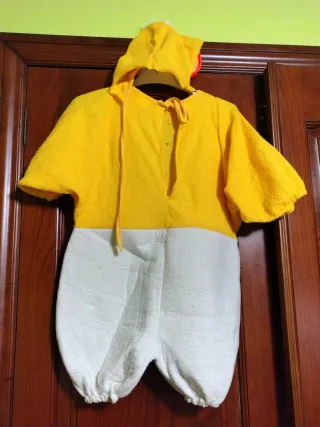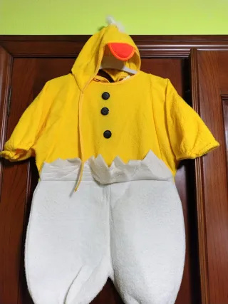 Disfraz tierno de pollito para bebé, perfecto para fiestas o para jugar. - Color amarillo brillante. - Capucha con pico naranja y detalle de plumón. - Cierre con botones negros. - Parte inferior blanca. - Material suave y cómodo.