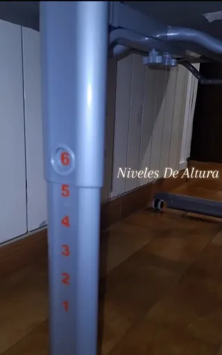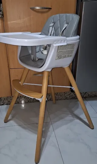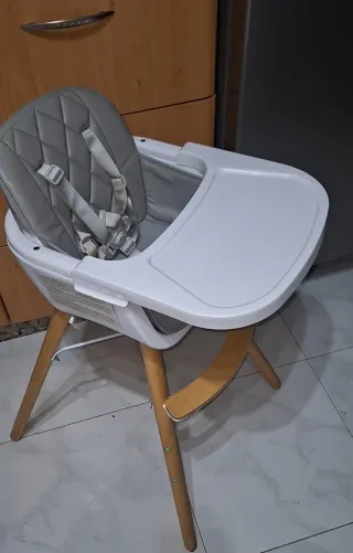 Completamente Nueva. Arnes en regla. - Asiento acolchado en color gris. - Estructura de patas de madera. - Bandeja extraíble blanca.
