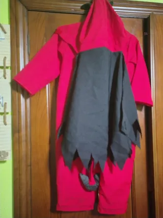 Disfraz de demonio para bebé, talla 24 meses. - Color rojo. - Incluye capucha con cuernos. - Detalle de tridente. - Adornos dorados en la parte inferior.
