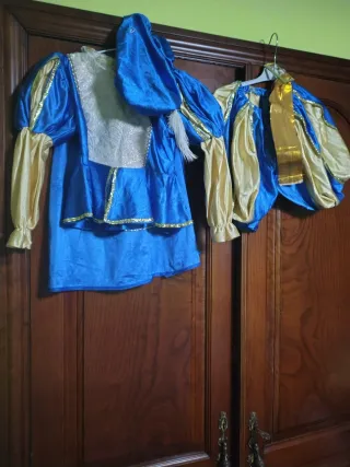 Disfraz de príncipe para niños pequeños, ideal para fiestas o eventos. - Talla 2-4 años. - Incluye traje completo y gorro. - Diseño con detalles dorados y azules.