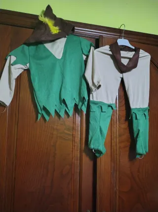 Disfraz de Peter Pan para bebé, talla 1 año. Incluye sombrero y traje. - Traje de dos piezas. - Sombrero marrón con plumas amarillas. - Mangas y parte inferior del pantalón en color beige. - Parte superior del traje en color verde con detalles de picos.Incluye cinturón marrón