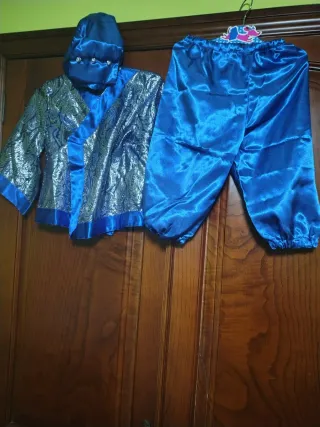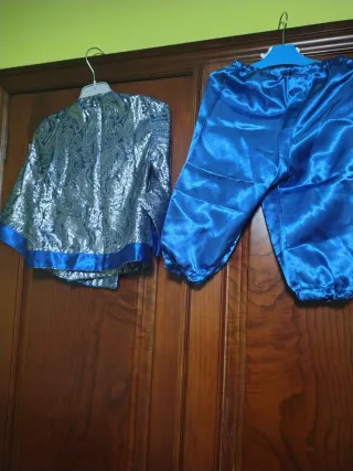 Conjunto de disfraz de estilo japonés, hecho a mano y diseñado para niños de 1 a 2 años. - Talla 1-2 años. - Diseño de dos piezas: chaqueta y pantalón. - Material satinado azul brillante. - Chaqueta con detalles plateados y cuello cruzado. -Gorro a juego con adornos.