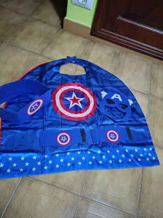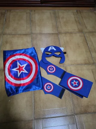 Conjunto de disfraz del Capitán América. - Capa azul con diseño del escudo. - Máscara. - Cinturón y muñequeras con detalles.