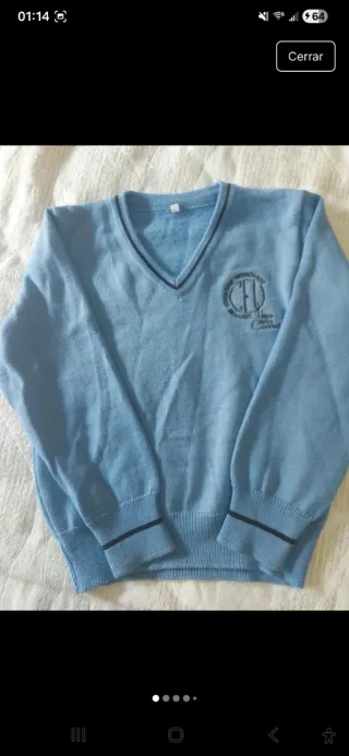 Polar azul claro para uniforme escolar de Hijas de la Caridad. - Talla 4 años / 104 cm. - Cierre de cremallera. - Bolsillos laterales.