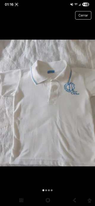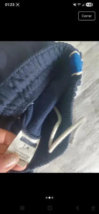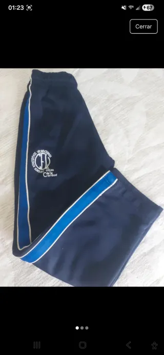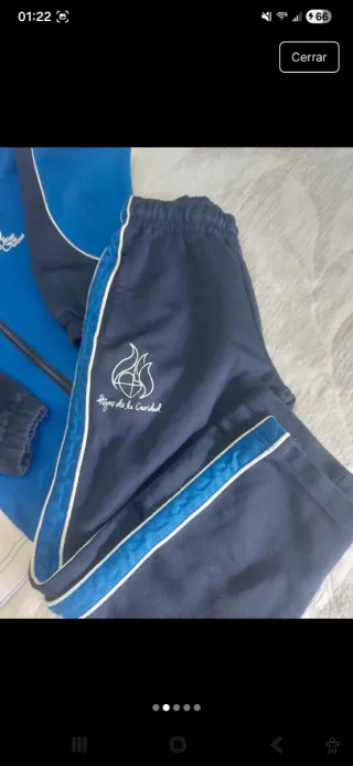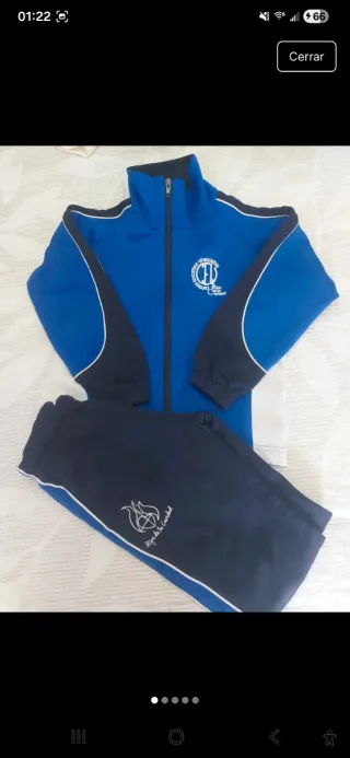 Chándal de uniforme, talla 4 (104 cm). - Conjunto de dos piezas: chaqueta y pantalón. - Chaqueta azul con detalles en blanco y marino. - Pantalón marino con detalles en azul. - Logo del colegio bordado en ambas prendas.
