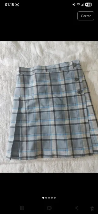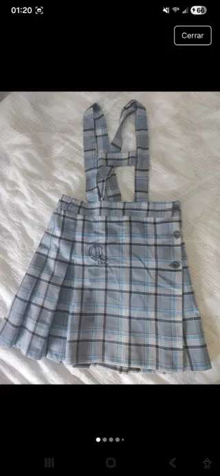 Falda de uniforme escolar de Hijas de la Caridad. Norte - Talla 4. - Diseño a cuadros en tonos azules y grises. - Con tirantes. - Detalle de botones laterales. Los pantys son talla 6 pero tallan como una 4 y los vendo a parte por 1,50€