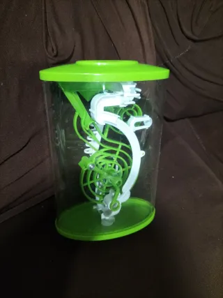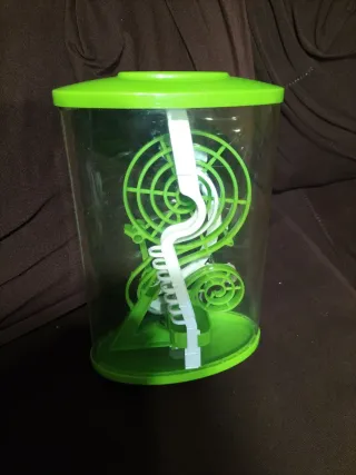 Divertido juego de laberinto en 3D con un diseño llamativo. - Cilindro transparente. - Tapa y base de color verde brillante. - Laberinto interior con espiral y rampas.