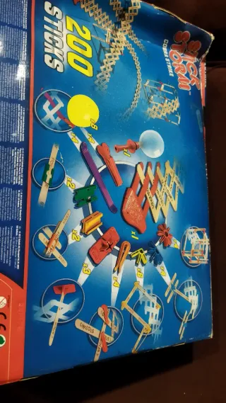 Juego de construcción Stick Storm Cobra Strike. Incluye piezas de plástico y palitos de madera para crear diversas estructuras. - Piezas de plástico de colores: azul, amarillo, rojo, naranja y morado. - 200 Palitos de madera. - Instrucciones incluidas. No tiene los globos La caja está por un lado y la tapa doblada y rota y no cierra bien Le falta una pieza roja de las que están en una foto solo dos