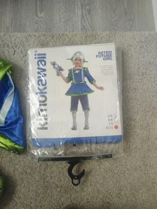 Disfraz de Retro Future Girl para niña, perfecto para fiestas temáticas o Halloween. - Talla: 5/6 años. - Incluye mono azul con detalles verdes y plateados. - Accesorios como antena.