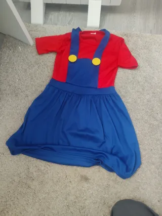 Disfraz inspirado en Mario Bros para niña. Ideal para fiestas o eventos. -Talla L niña 120/130 cm. - Parte superior roja con peto azul. - Detalles amarillos en el peto. - Falda azul. - Manga corta.