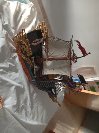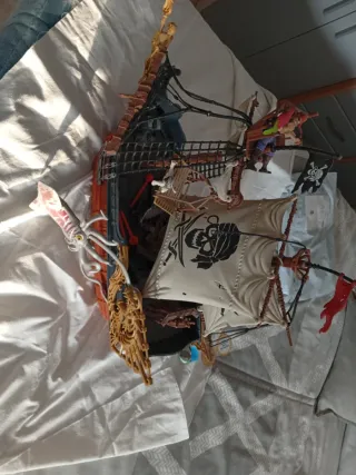 Barco pirata de juguete con detalles. - Velas con diseño de calavera. - Figuras de piratas. - Accesorios temáticos.