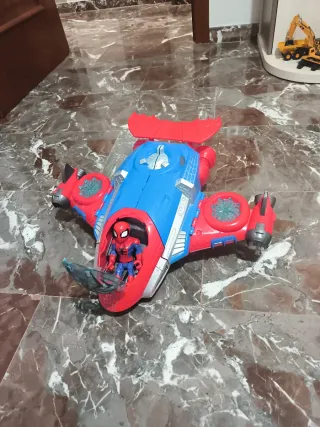 Avión de juguete con temática de Spiderman. Ideal para coleccionistas o para jugar. - Diseño inspirado en Spiderman. - Colores rojo y azul predominantes. - Cabina transparente.