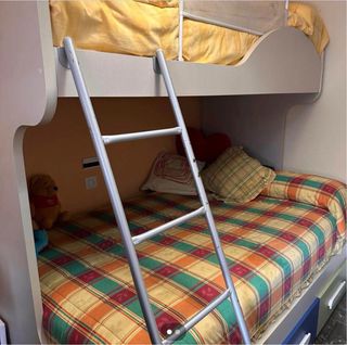 Cama litera con un diseño funcional y moderno. - Estructura robusta. - Incluye escalera de acceso. - Colores vivos en la ropa de cama.