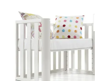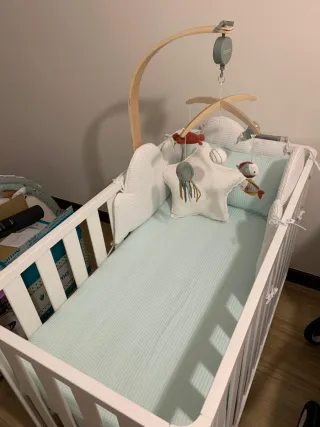 Cuna colecho Doco en color blanco, ideal para tener a tu bebé cerca. Incluye varios accesorios. - Estructura de madera blanca. - Colchón con funda. - Móvil de cuna con figuras. - Protector de cuna. - Chichoneras