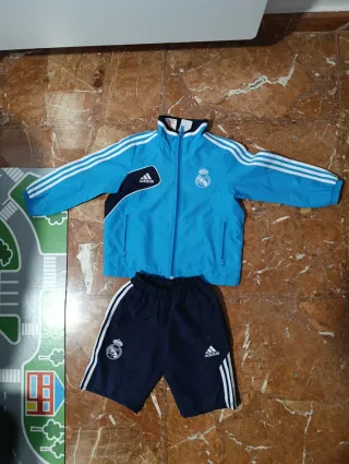 Conjunto deportivo del Real Madrid. - Chaqueta azul con detalles negros y blancos. - Pantalón corto azul con detalles blancos. - Logos de Adidas y escudo del Real Madrid.