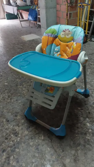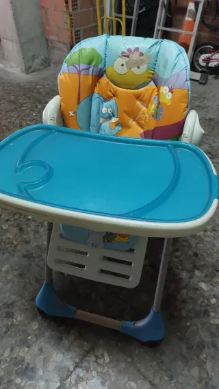 Silla de comer para bebés con un divertido diseño. - Cojín acolchado con dibujos infantiles. - Bandeja azul desmontable. - Estructura plegable para fácil almacenamiento.