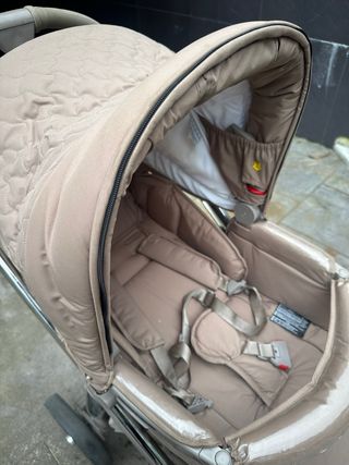 Carro de bebé en color marrón y beige . - Capazo espacioso. - Bolsa a juego. - Recambio de cubre capazo a juego de capota - Silla -Bolso NO incluido