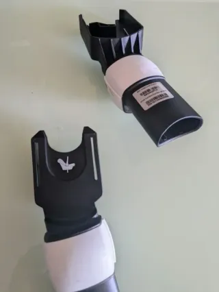 Adaptadores para conectar sillas de coche Maxi-Cosi a carritos Bugaboo. Son de color negro con una banda blanca. - Diseño en negro. - Banda de color blanco.