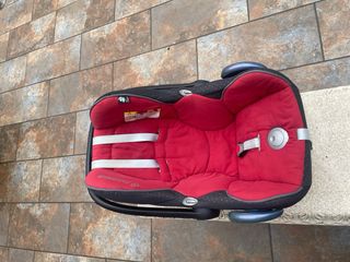 Silla de coche Maxi-Cosi en color negro y rojo. - Compatible con sistemas Bugaboo. - Diseño con pequeños puntos. - Asa de transporte. - Capota ajustable. se entrega con funda de punto gris para ir calentito..y un reductor posts el primer día según sale de hospital...