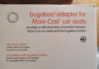 Adaptador Bugaboo para sillas de coche Maxi-Cosi. Permite una conexión segura y fácil entre las sillas de coche y el cochecito Bugaboo Fox. - Sistema click & go para un montaje rápido. - Compatible con marcas adicionales de sillas de coche. - Diseñado para Bugaboo Buffalo y Bugaboo Fox.