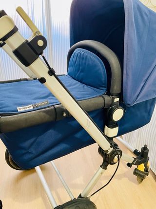 Carro Bugaboo modelo 1. - Dos sillas con asiento negro con arnés de seguridad. - Dos capazos con Capota de color azul claro. - Cesta de almacenamiento inferior negra. - Cesta lateral negra - Maxicosi con adaptador para carro - Isofix para poner el maxicosi en el coche Buen estado de todo