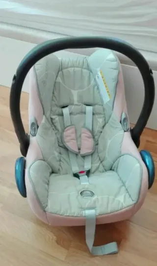 Silla para coche grupo 0+ Maxicosi Cabrio con base isofix Family fix. Incluye también saco de invierno y capota rosa a juego. En la base no funcionan los indicadores porque se sulfataron las pilas y se estropeó la parte electrónica, pero por el resto está bien, sin accidentes y segura (revisada en tienda para saber que enganchaba bien).